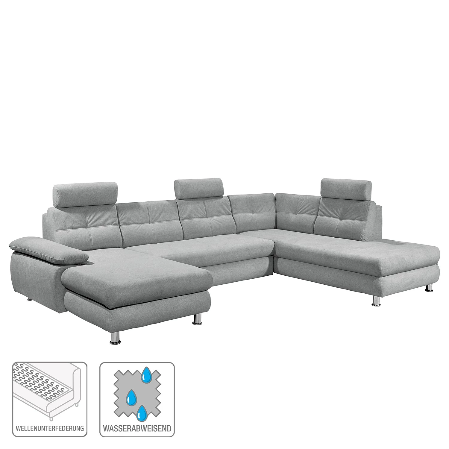 Fredriks Canapé panoramique Ordino – Tissu – Gris clair – Méridienne courte à gauche / longue à droite (vue de face)