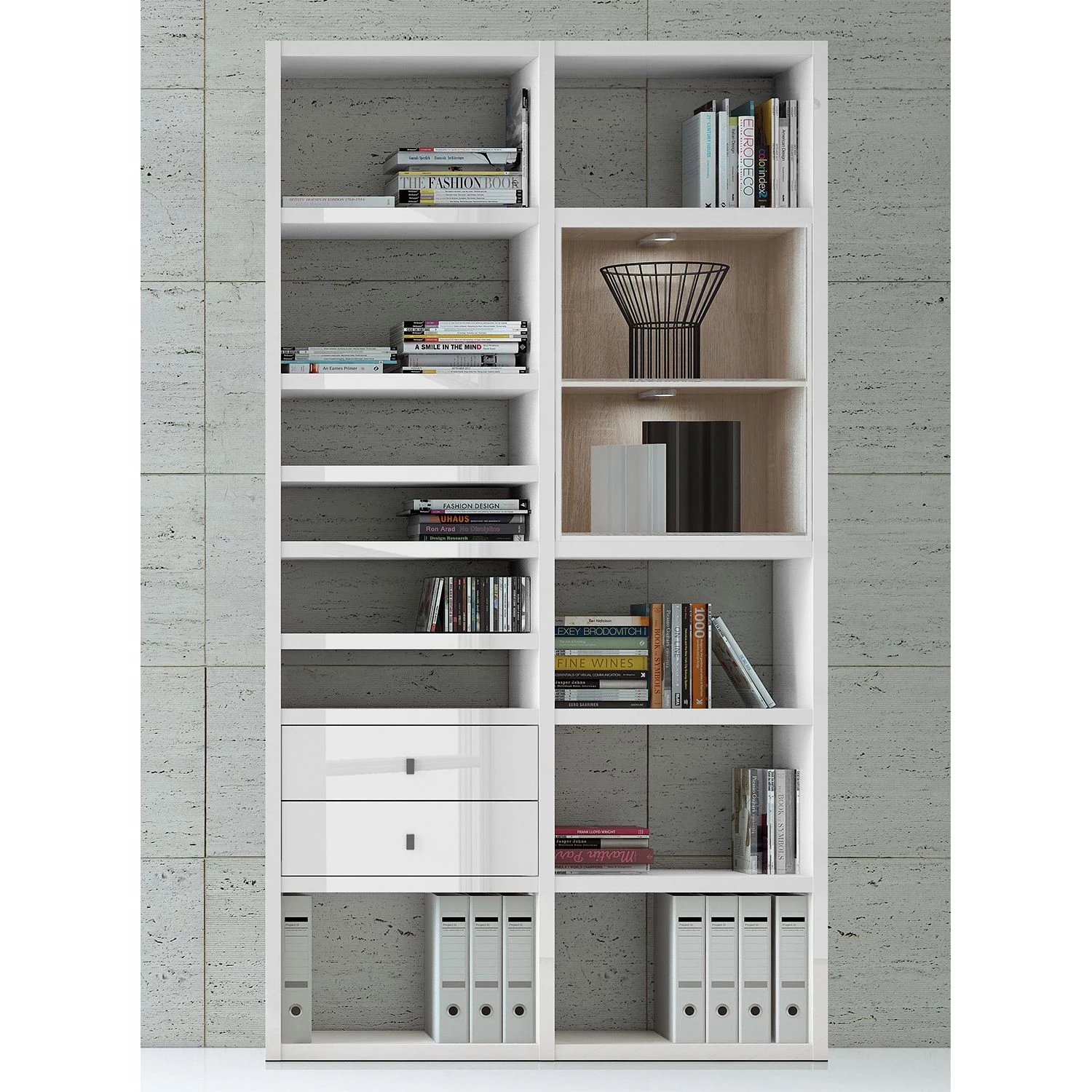Fredriks Etagère Emporior I – Blanc brillant / Imitation chêne de Sonoma – Avec éclairage