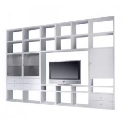 - Contenu de la livraison : Ensemble comprenant 1 vitrine, 1 étagère murale, 1 meuble TV et 1 meuble haut, avec éclairage, sans décoration