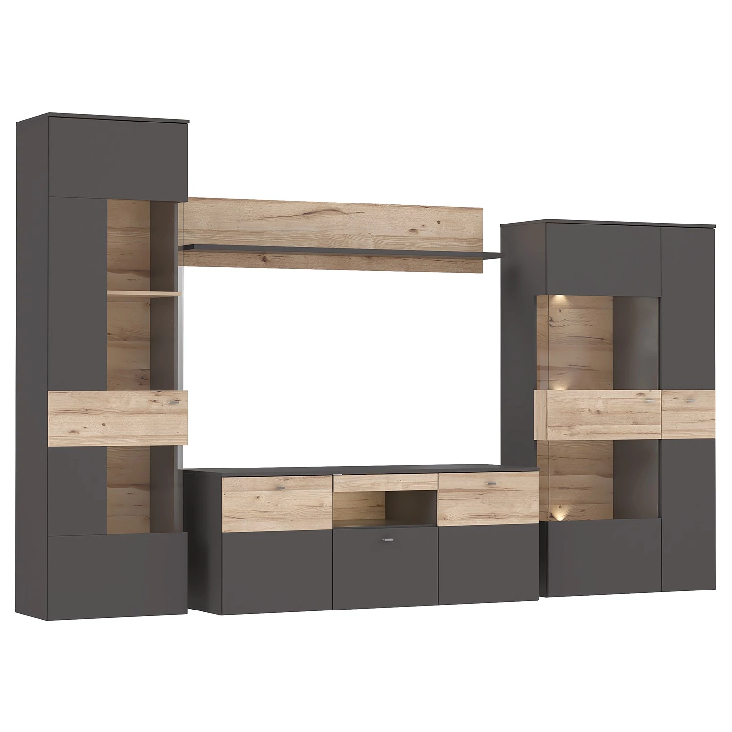 - Contenu de la livraison : Ensemble comprenant 1 vitrine, 1 tablette murale, 1 meuble TV et 1 buffet haut, avec éclairage et sans accessoires
