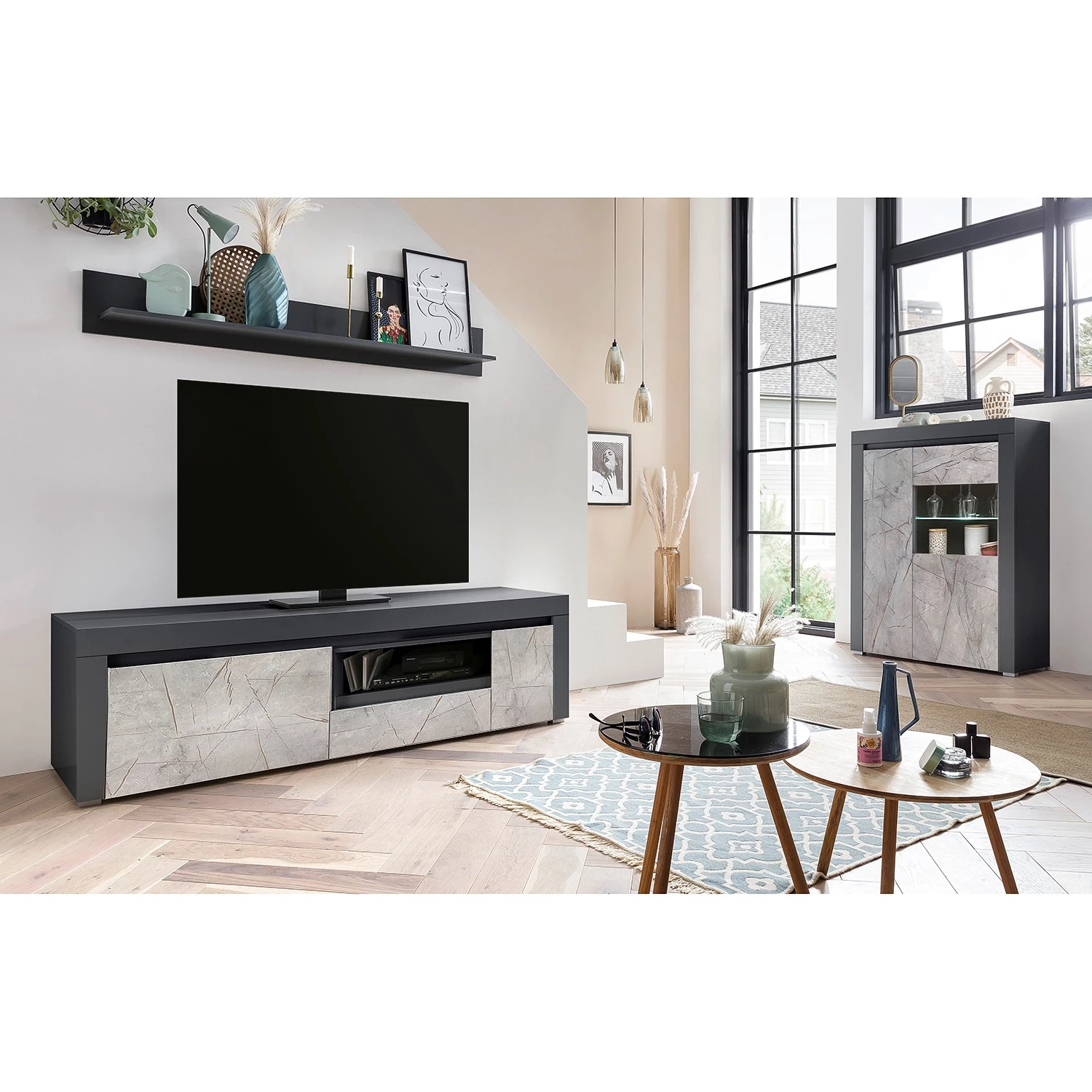 - Contenu de la livraison : Ensemble comprenant 1 buffet haut, 1 tablette murale et 1 meuble TV sans éclairage ni accessoires